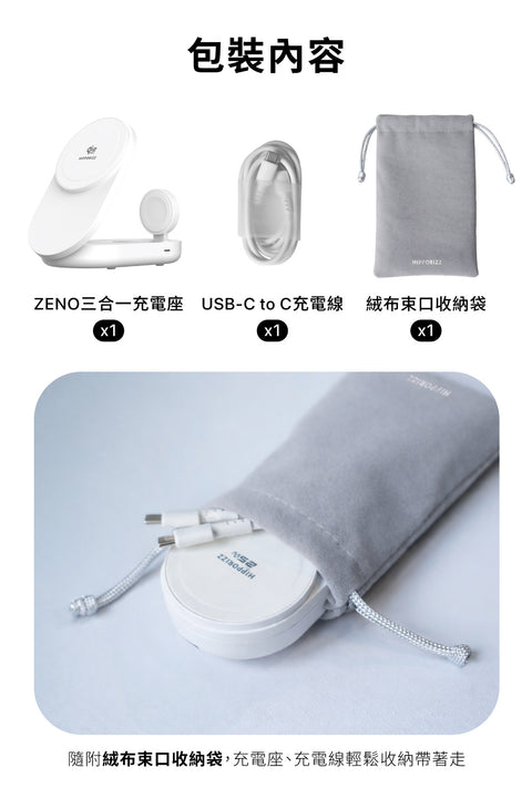 包裝內容物: ZENO 三合一充電座 ×1、USB-C to C 充電線 ×1、絨布束口收納袋 ×1