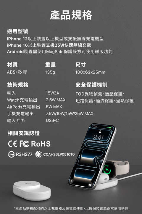 「 Hipporizz Zeno 三合一無線充電座 」支援的是 Qi2.2 無線充電協議,因為 Qi 無線充電是不分 iPhone 或 Android,因此適用於支援無線充電的所有手機。只是如果要將 Qi2.2 無線充電協議發揮到最佳化,則必須要選擇支援該協議的 Android 手機或者 iPhone 17 全系列手機。